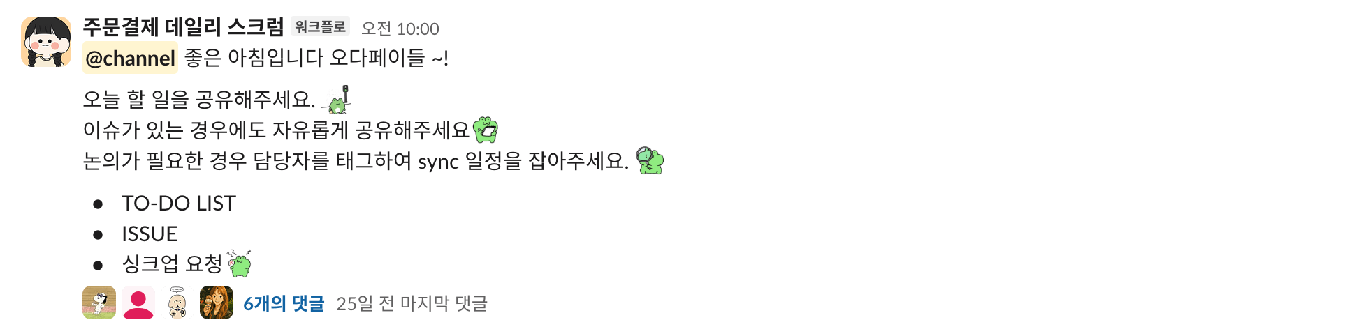 그러나 PR 템플릿만으로 모든 문제가 해결되지는 않았습니다. 바쁜 일정 속에서 스쿼드원들의 피로도가 누적되고, 서로의 업무 상황을 파악하기 어려워 소통이 부족해지는 문제가 있었습니다. 우리는 '서로 잘 도와줄 수 있는 환경을 만들자'는 목표 아래, Slack 내에 데일리 스크럼 봇을 도입하여 매일 아침 간단하게 업무 진행 상황을 공유하는 문화를 정착시켰습니다.