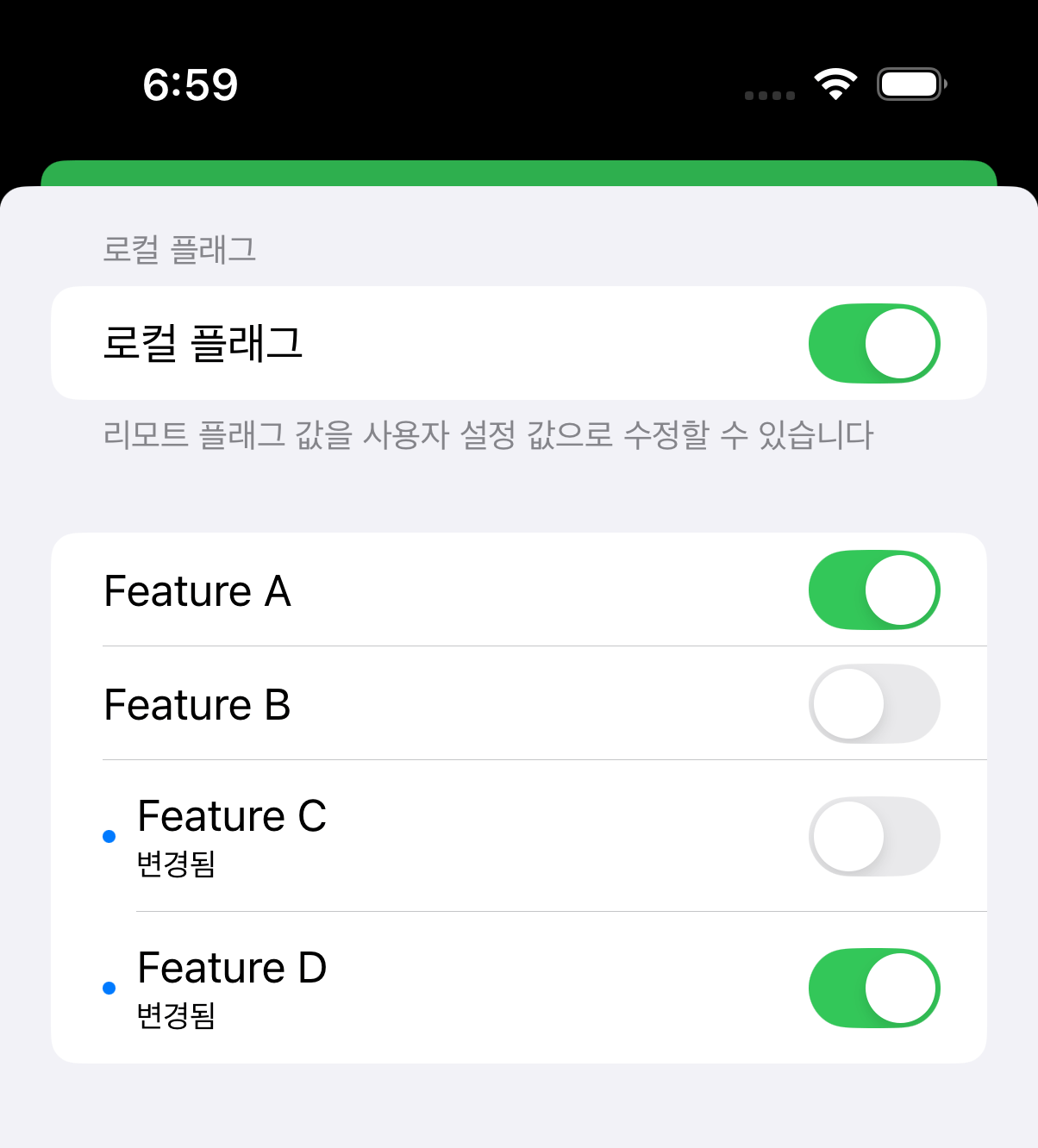 이와 같은 이유로 기능 플래그 값을 직접 수정하지 않고 테스트폰에서 직접 플래그 값을 조절할 수 있는 로컬 플래그 를 개발하게 되었습니다.