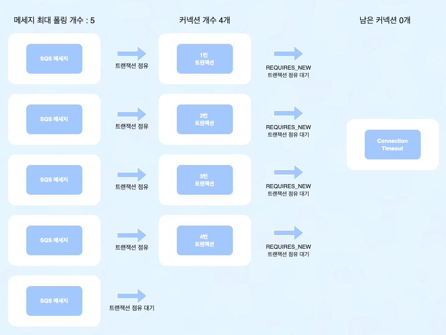 - 커넥션 점유의 불균형: SQS의 MaxNumberOfMessages 가 DB 커넥션 풀 크기보다 크게 설정되어 있었습니다. (커넥션 개수 < 최대 폴링 메시지 개수)