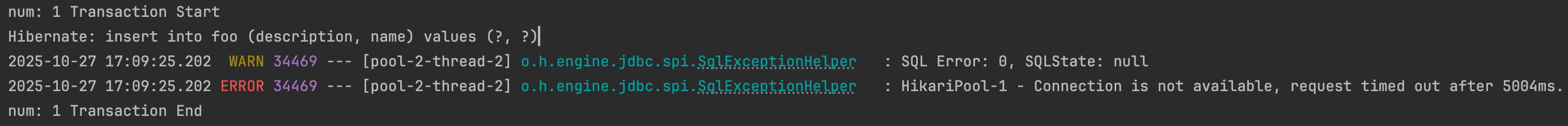 - 스레드2 트랜잭션 커넥션 점유 대기 5초 초과로 인한 에러 발생 (