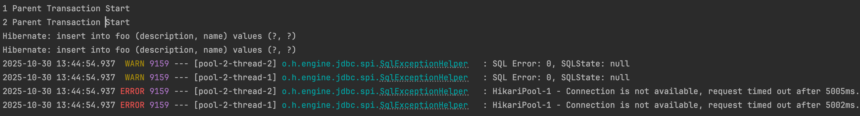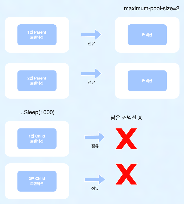 fooTransactionParent()2번 호출 1번 Parent 트랜잭션커넥션 1개 점유2번 Parent 트랜잭션커넥션 1개 점유1번 Parent 트랜잭션Save 및 1초후1번 Child 트랜잭션점유를 위해 대기 (이미 커넥션은 모두 점유된 상태)- 1번 트랜잭션과 동일하게