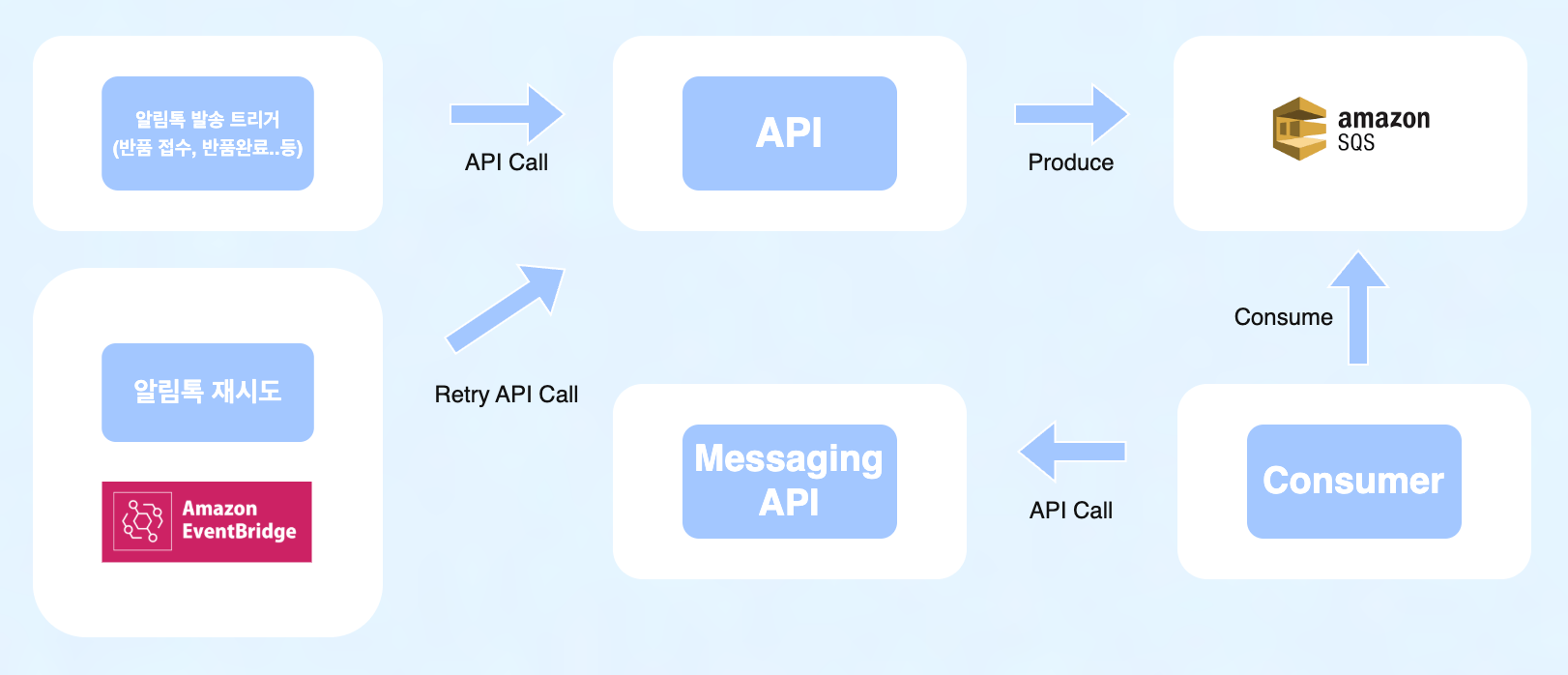 발송 실패 시에는 실패 로그를 DB에 적재하며, Amazon EventBridge를 통해 주기적으로 재시도 API를 호출하여 위 프로세스를 반복하게 됩니다.