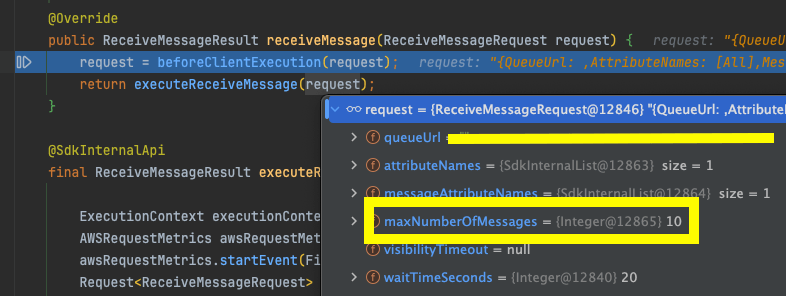 }또한 SQS 폴링시 메시지 개수 파라미터로 보낸다는 것을 확인할 수 있습니다.