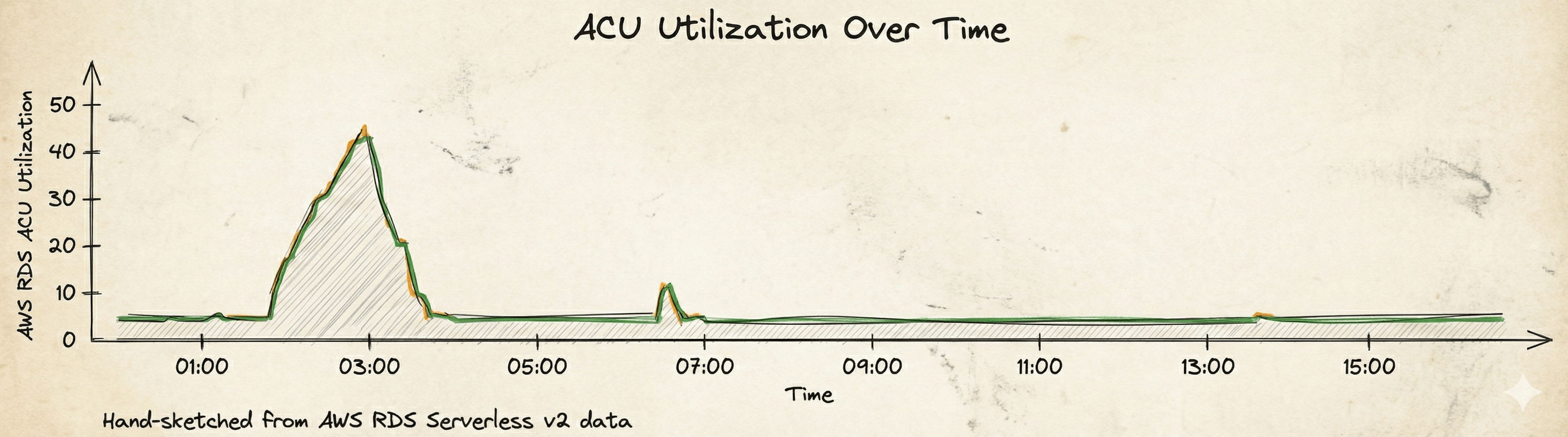 도입 후 저희는 Serverless v2가 보여준 야생성에 놀랐습니다. 배치가 시작되고 데이터가 급격히 유입되면, DB의 ACU(Aurora Capacity Unit) 가 수직 상승하며 부하를 받아냈습니다. 반대로 작업이 끝나거나 데이터 양이 적은 날에는 즉시 최저 사양(Min ACU)으로 줄어들어 숨을 고르는 걸 볼 수 있었습니다. 운영자가 "오늘 데이터가 많을까?"를 고민하며 미리 스펙을 올리고 내릴 필요가 없어진 것입니다. 시스템이 데이터의 파도에 맞춰 스스로 서핑을 하는 셈입니다.