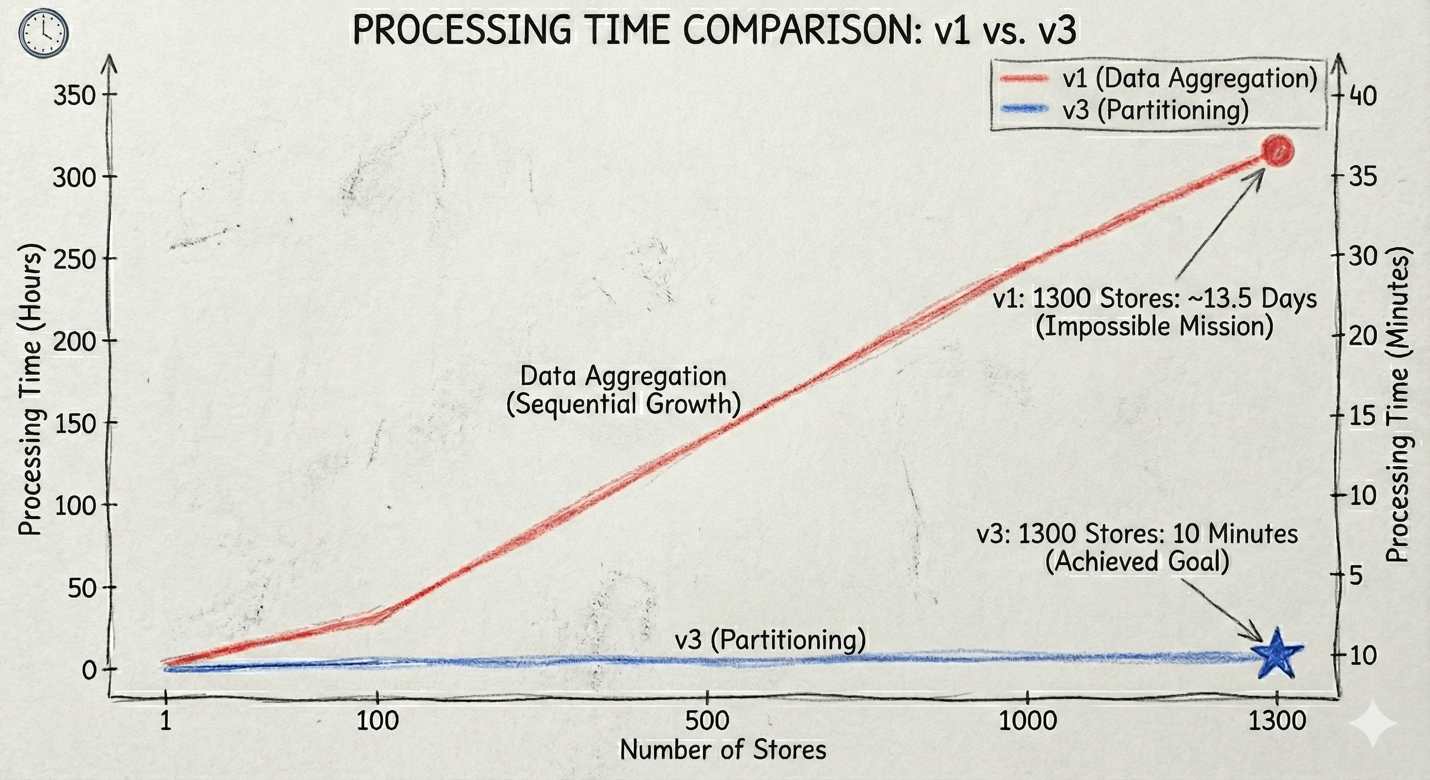 전자라벨 시스템의 배치는 상품 데이터 중 변경된 데이터(Delta)를 찾아내는 고된 작업입니다. 초기 버전(V1) 성능 테스트 결과, 복잡한 데이터 집계(Aggregation) 로직으로 인해 1개 매장을 처리하는 데 평균 15분이 소요되었습니다. 이 속도라면 1,300개 매장을 순차적으로 처리할 경우 약 13일(15분 × 1,300개)이 걸린다는 충격적인 결과가 도출됩니다. 매장 오픈 시간(오전 10시)까지 작업을 끝내야 하는 저희에게 이는 말그대로 '불가능한 미션'이었습니다.