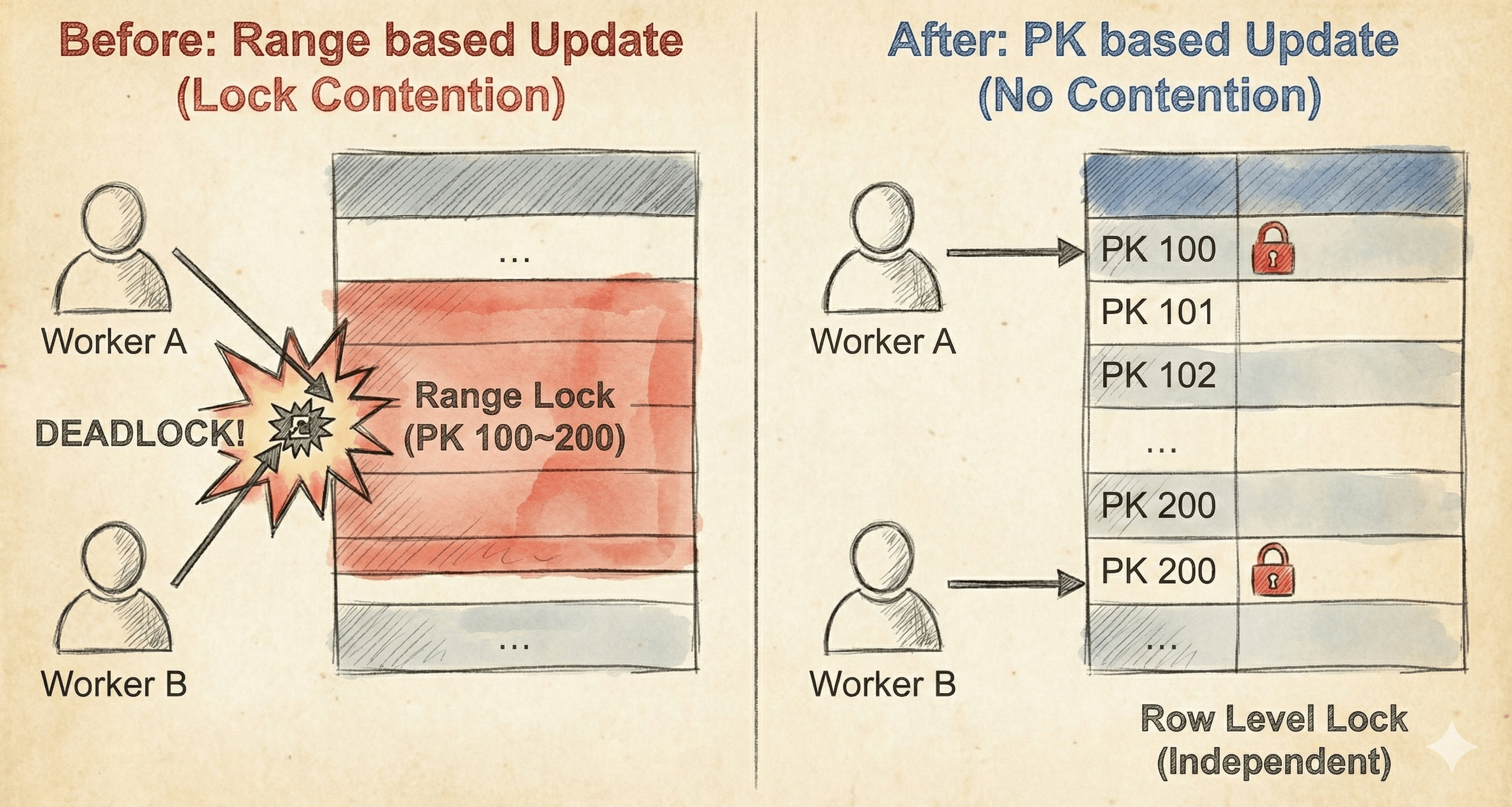 Lock Free 구조: 각 Worker Step은 자신에게 할당된 고유한 PK 범위 내에서만 집계(Aggregation)와 갱신(Update)을 수행합니다.