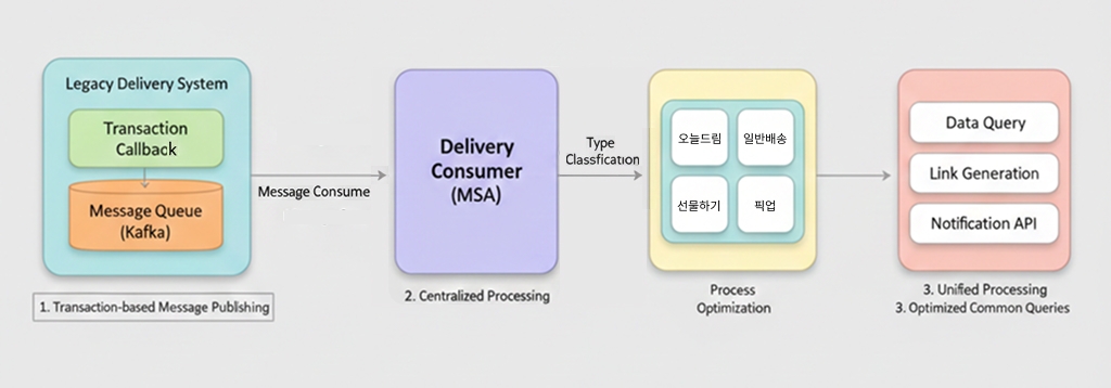 | 관리 주체 | 각 비즈니스 도메인 서비스 | 배송 컨슈머(Delivery Consumer)로 일원화 |
