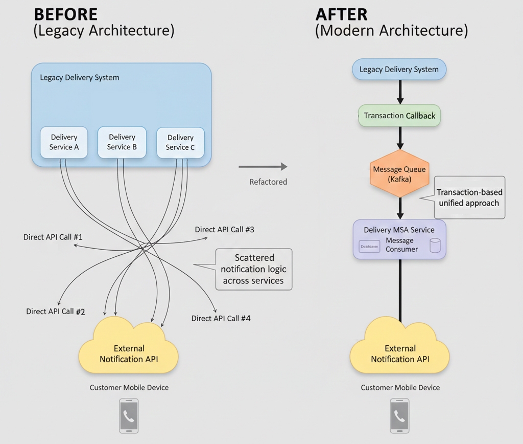이제 레거시 시스템과 모던 아키텍처 시스템이 어떻게 연결되고, 어떤 시점에 실제 발송 흐름이 시작되는지 살펴보겠습니다. 레거시에서 트랜잭션 커밋 이후에 Kafka 메시지를 발행하고, MSA의 Delivery Consumer 서비스가 이를 소비(consume)합니다. 이제부터는 레거시가 아니라, Delivery Consumer가 모든 발송 처리를 전담하게 됩니다.