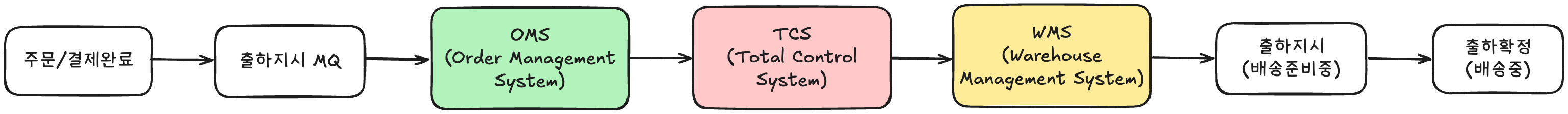 고객이 주문/결제를 완료하면 출하지시 MQ(Message Queue, 메시지 큐)를 통해 주문관리시스템(OMS) → 운송관리시스템(TCS) → 창고관리시스템(WMS) 순으로 하나의 흐름을 타고 내려가며, 최종적으로