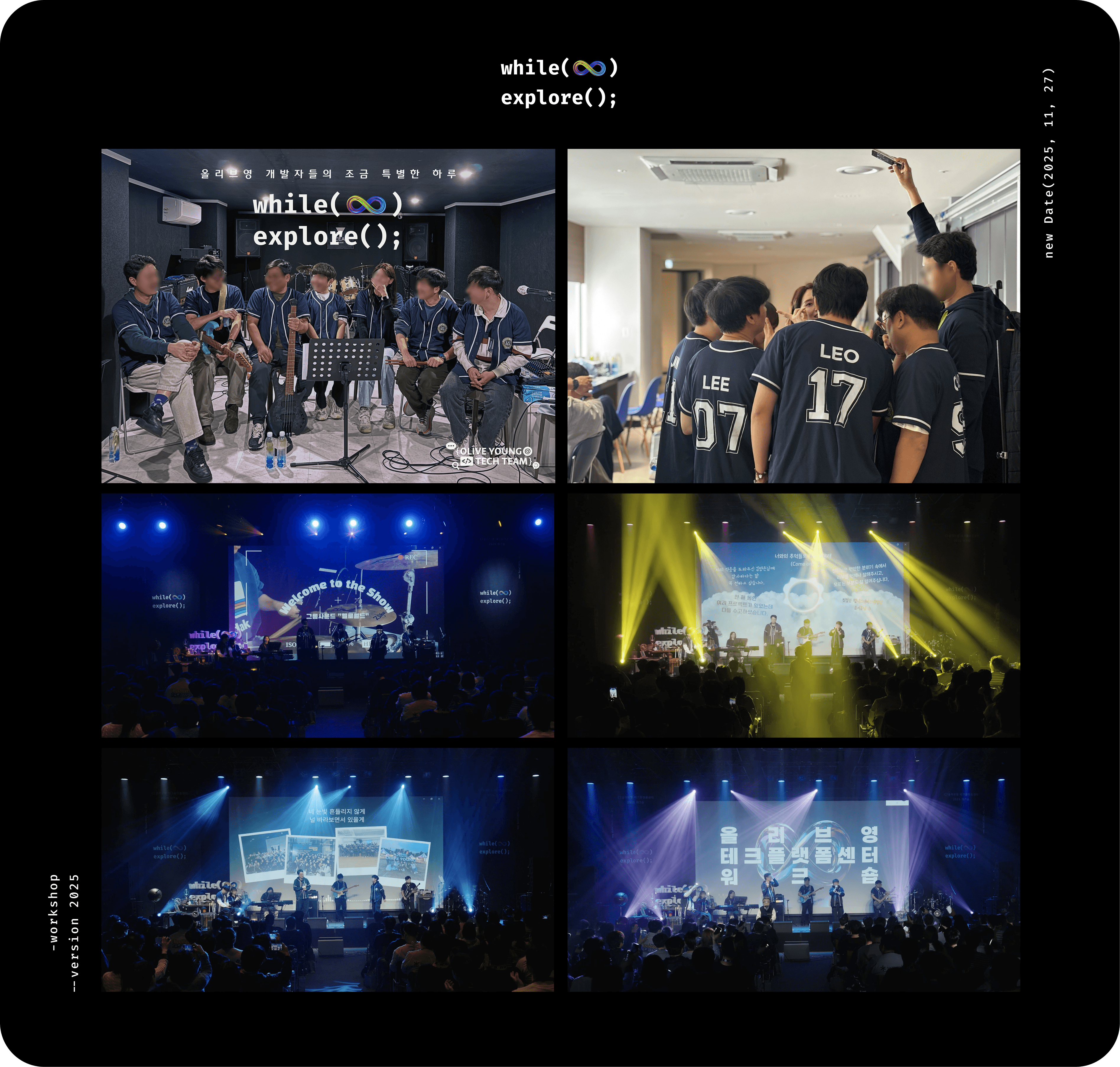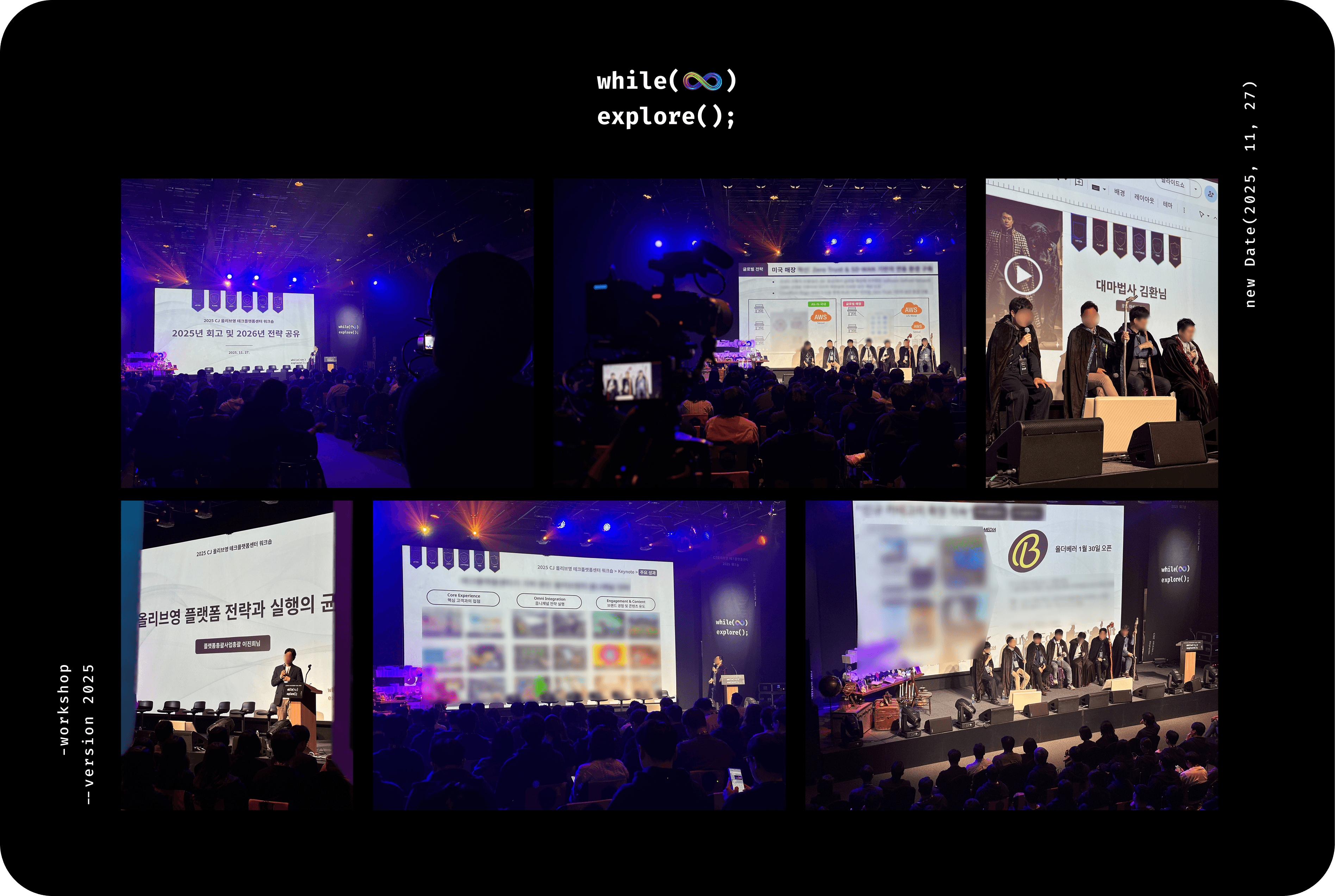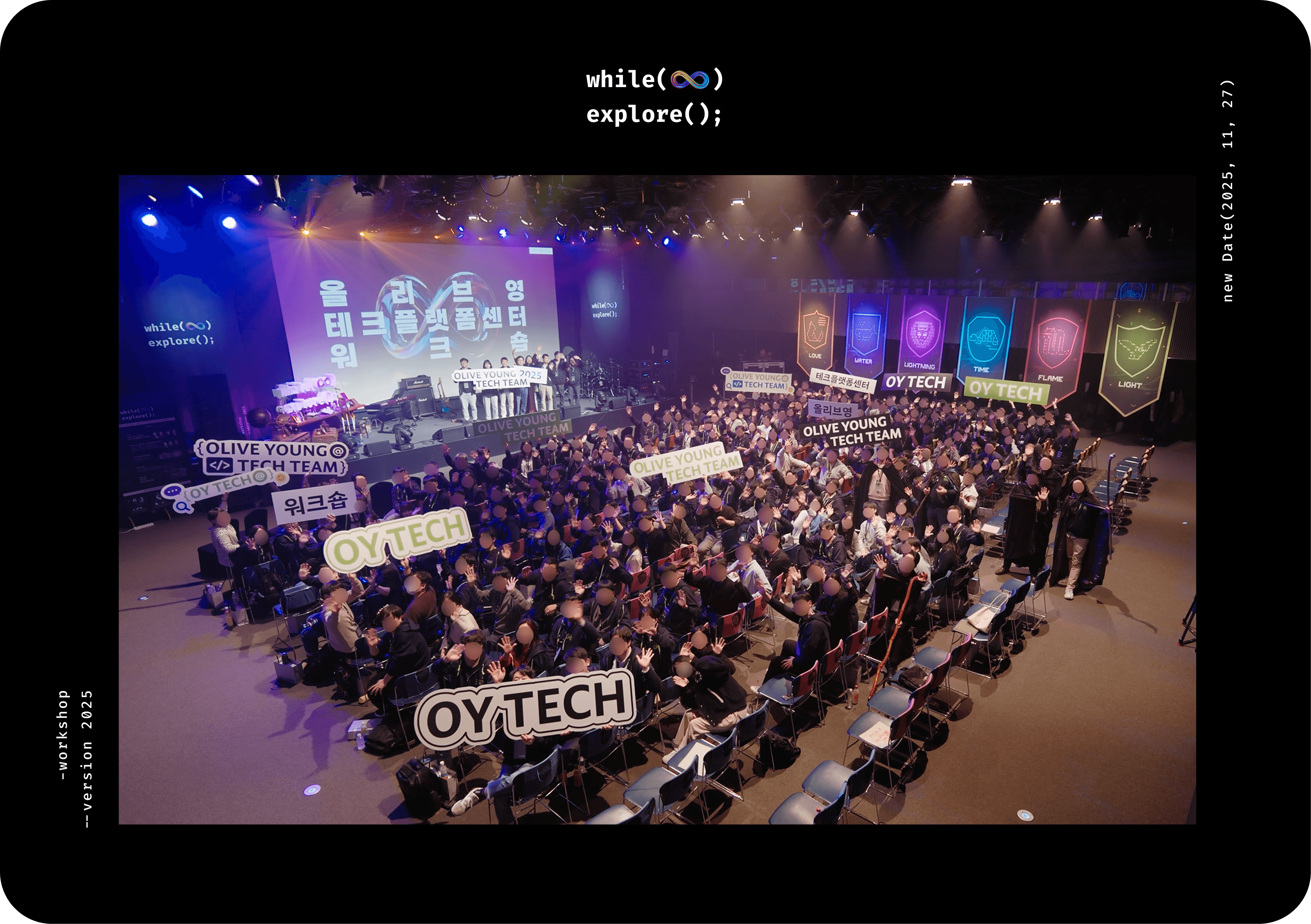 네임카드와 랜야드를 목에 건 구성원들이 홀 안으로 들어서는 순간, 다시 한 번 멈칫했습니다. 해리포터 속 대연회장처럼 대형 휘장이 양쪽으로 늘어서 있고, 테마파크에 입장하는 것 같은 휘황찬란한 조명과 웅장한 음악이 공간 전체를 감싸고 있었습니다. 회사 워크숍에 왔는데 디지털 마법사 세계에 접속한 것 같은 첫인상이었습니다. 2025년의 올리브영 테크플랫폼센터의 연례 워크숍은 그렇게, 어리둥절함과 설렘이 뒤섞인 채 시작되었습니다.
