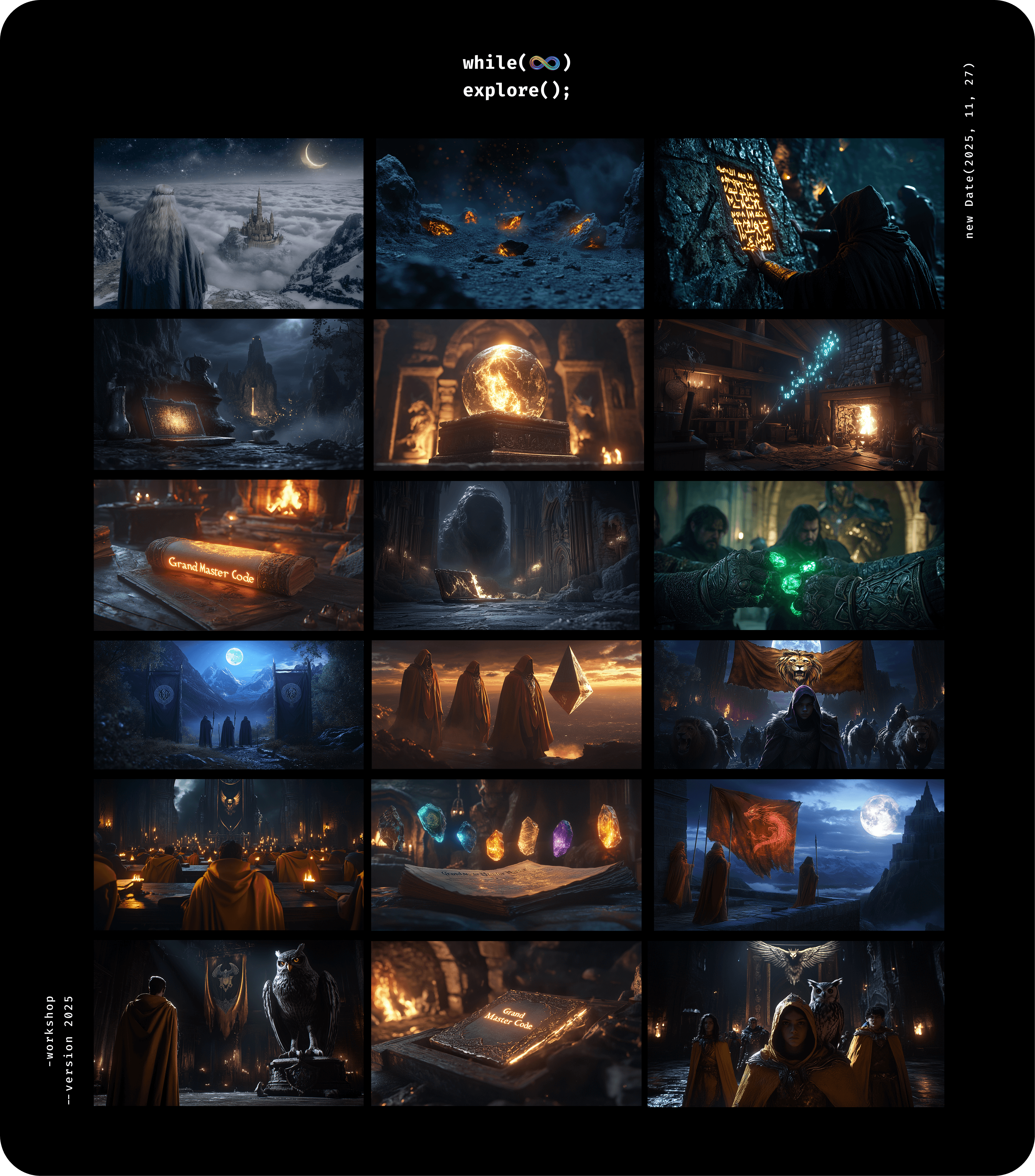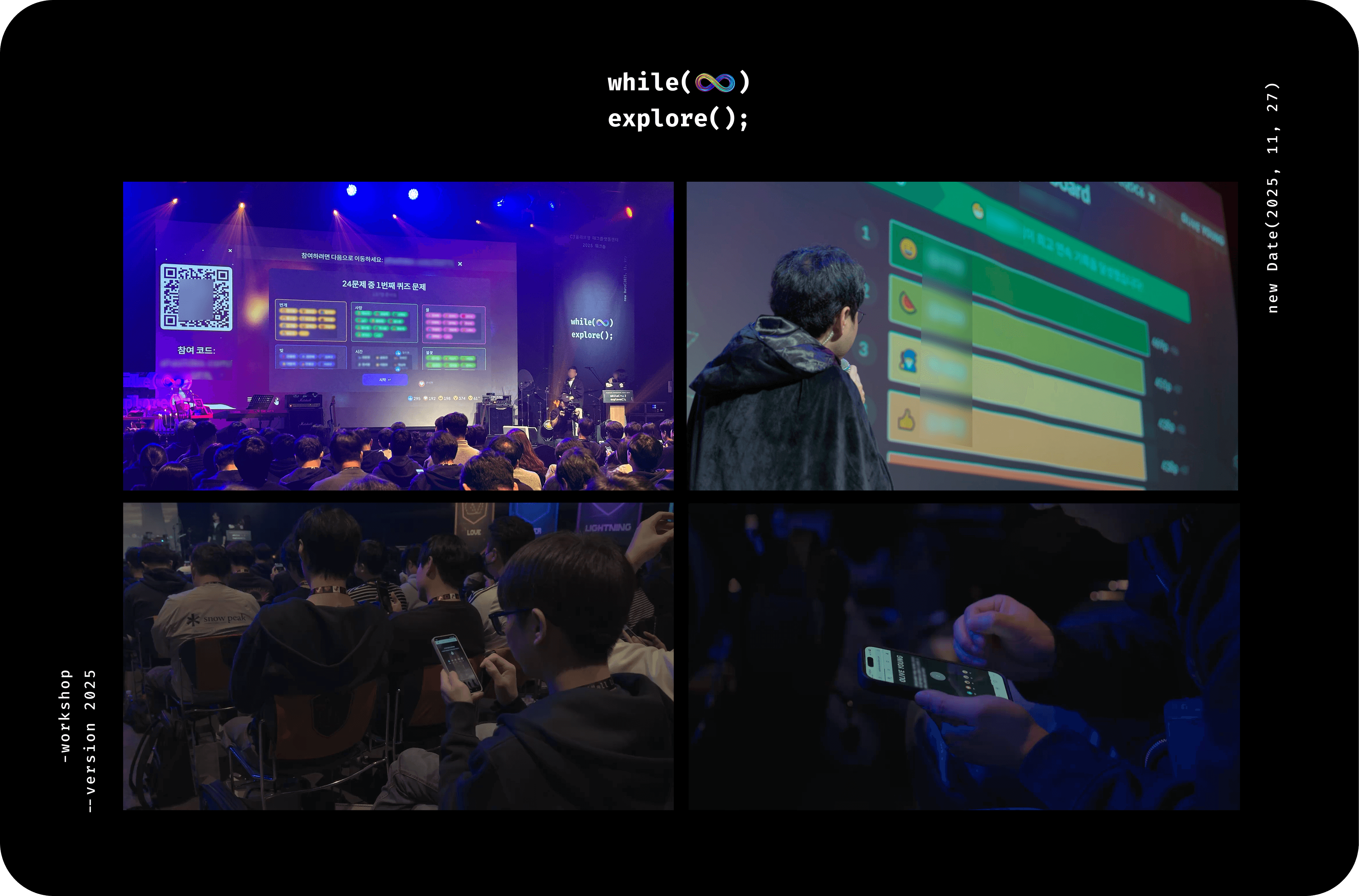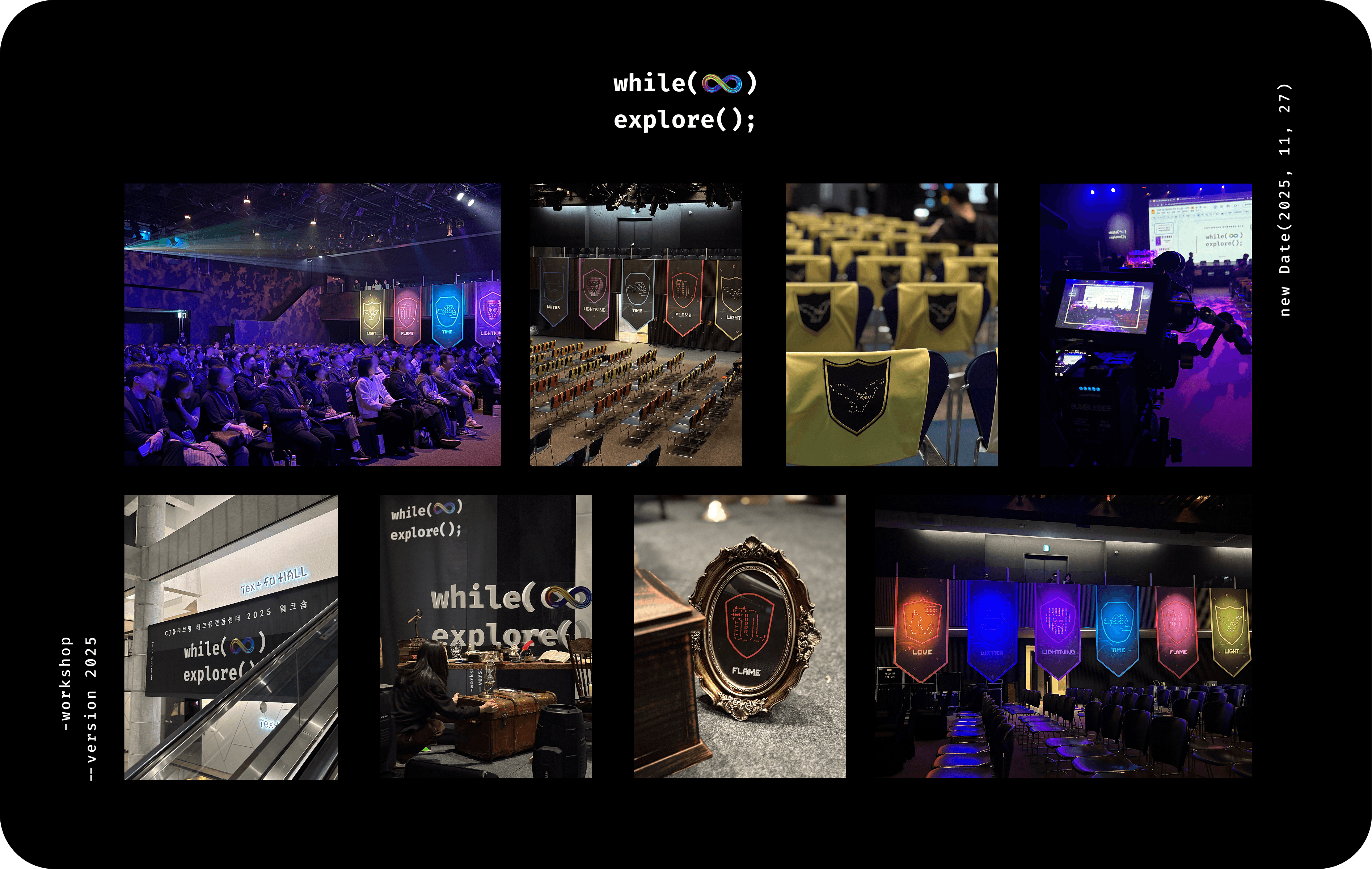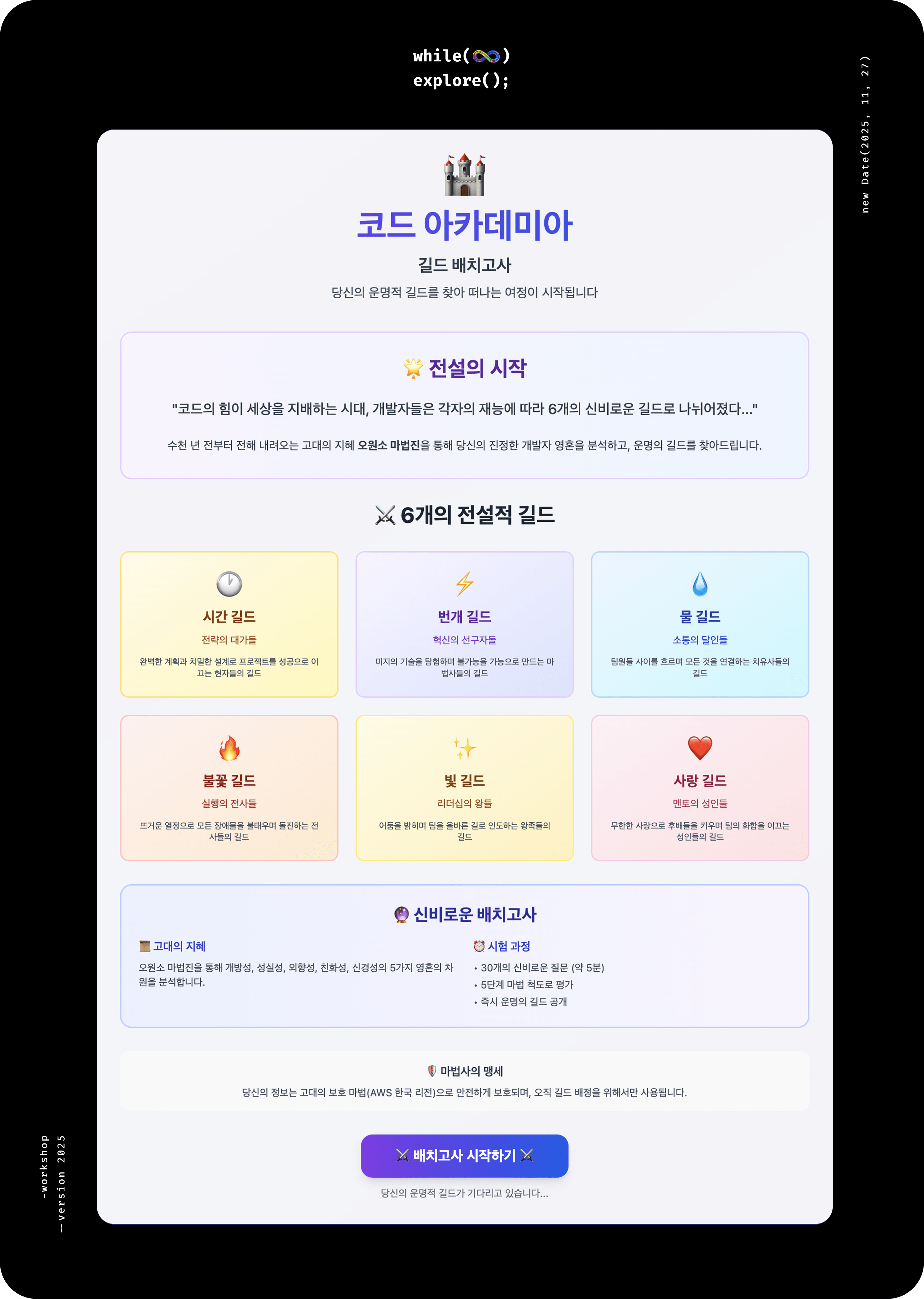 워크숍 2주 전, 슬랙에 한 장의 공지가 올라왔습니다. while(∞) explore();라는 슬로건과 "무한히 탐색하라. 그리고 함께 생각하고, 서로 탐색하고, 온전히 즐기는 하루가 되자"라는 목표 아래, 올해는 작년 아이디어톤 형식과 완전히 다른 컨셉으로 준비했다는 안내였습니다. 마법사 세계관 속 길드 배치고사, 몰입형 빅게임 등 낯선 단어들이 눈에 띄었지만, 그것이 어떤 경험이 될지는 아직 아무도 몰랐습니다.