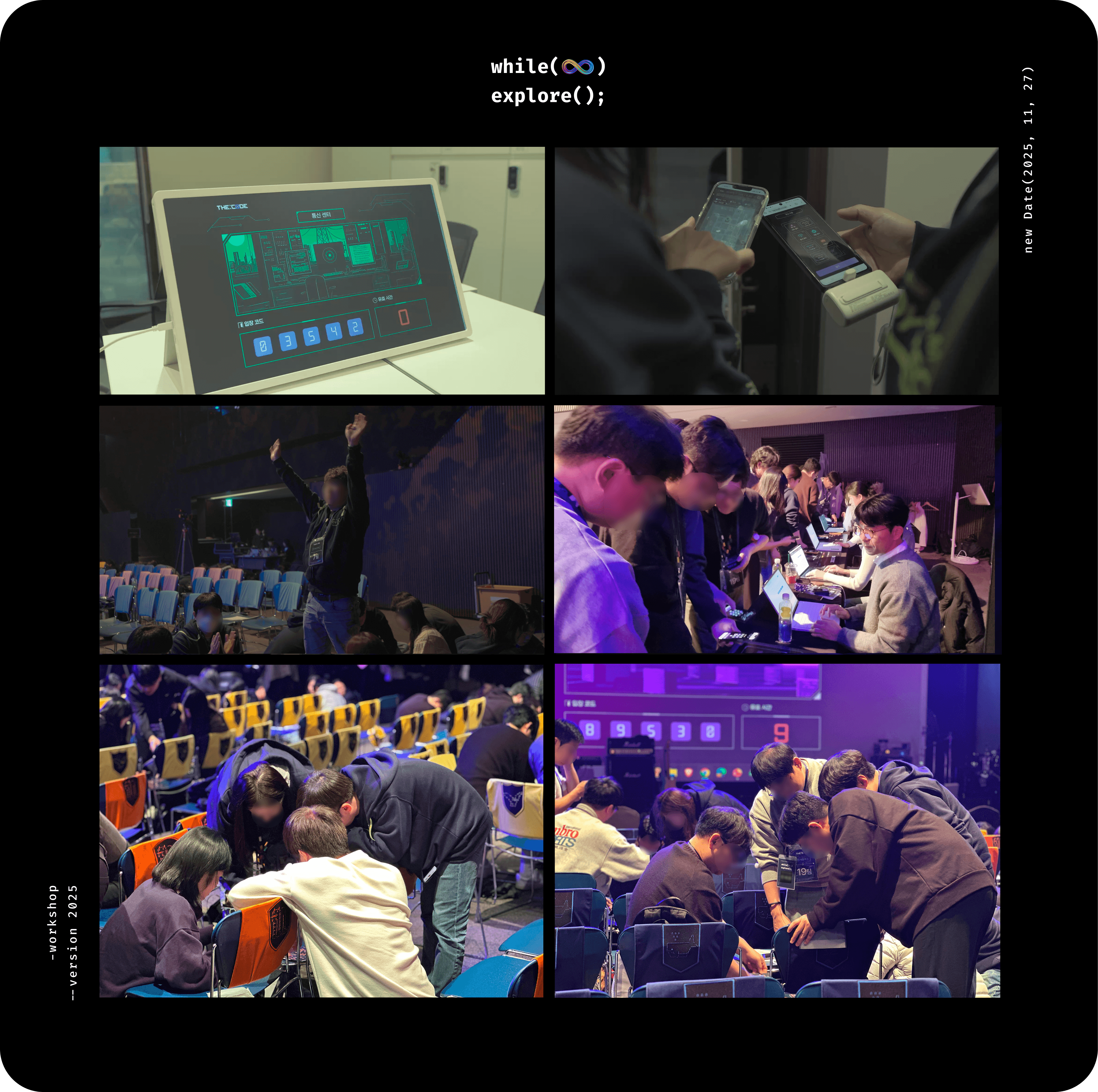 THE:CODE에는 의도적으로 빠뜨린 것이 하나 있습니다. 바로 "이건 협력 게임입니다"라는 안내입니다. 경쟁인지 협력인지 알려주지 않은 채 미션을 시작한 이유는, 모호한 상황에서 사람이 보이는 첫 번째 반응이 그 사람의 실제 협업 스타일과 가깝기 때문입니다. 자기 조의 답을 먼저 확보한 뒤 관망하는 사람, 슬쩍 힌트를 흘리는 사람, 풀이를 통째로 공유하는 사람 등 이들의 반응은 게임 속 행동이 아니라, 평소 팀 간 의존성이 생겼을 때 각자가 보이는 패턴 그 자체일 수 있습니다. THE:CODE는 협력을 가르치려 한 게 아니라, 평소에는 보이지 않는 조직의 협업 패턴을 한 공간에서 가시화한 것에 가깝습니다. 솔직히 말하면, 가시화된 결과가 전부 아름답지는 않을 수 있습니다. 관망하는 비율이 적극적으로 공유하는 비율보다 높을 수 있고, "협력 게임이었다니"라는 설문 후기는 반전에 대한 감탄인 동시에 경쟁이 기본값이었다는 반증이 될 수도 있습니다. 하지만 그 장면을 함께 목격하고 깨달음을 얻은 것 자체가 이 게임의 진짜 성과였다고 생각합니다. 실제 업무에서 비슷한 상황이 왔을 때, THE:CODE에서 함께 깨우친 이 장면들이 행동을 바꾸는 공유 기억이 되기를 기대합니다.