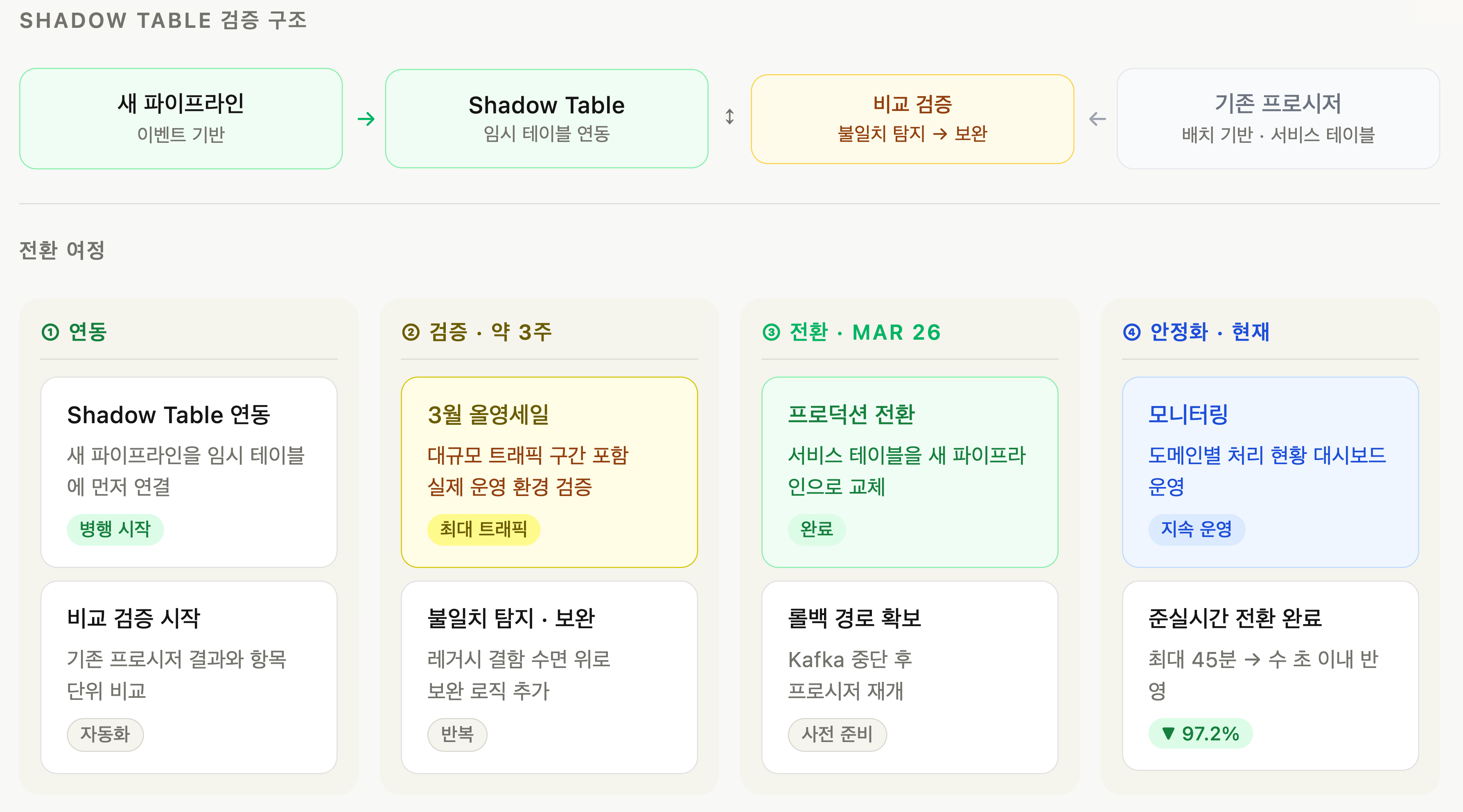 10년간 쌓인 프로시저가 만들어내는 결과물과 새 파이프라인의 결과물이 일치하는지 사전에 보장하기 어려웠습니다. 전환 도중 테이블 상태가 일시적으로 불일치하거나, 예상치 못한 레거시 예외 케이스가 드러날 경우 대체 전략(Fallback Strategy)이 없으면 서비스에 직접적인 영향을 줄 수 있습니다. 즉, 이번 전환의 핵심 과제 중 하나는 오래된 레거시 환경에서 서비스 중단 없이 안전하게 배포하는 것이었습니다.