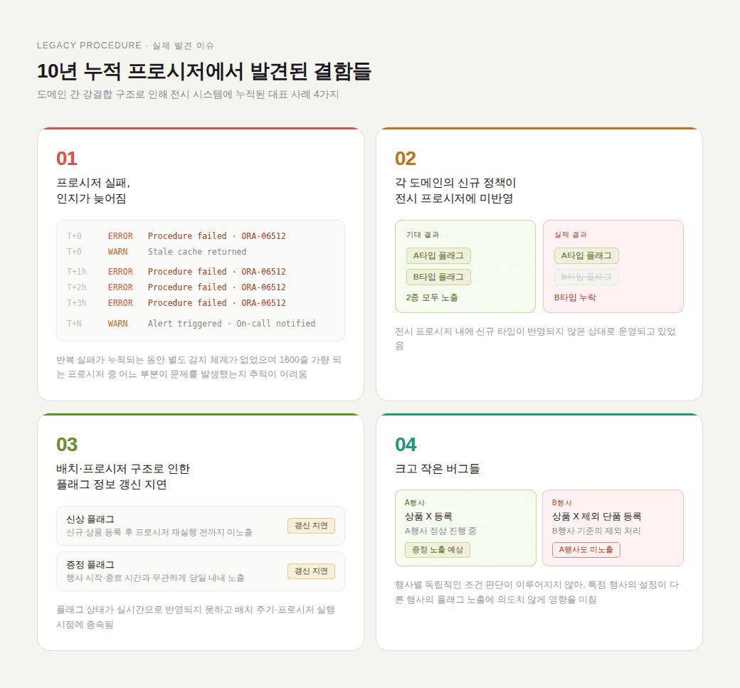 문제는 이 과정에서 각 도메인의 실제 비즈니스 로직이 10년 이상 누적된 단일 프로시저 안에 불투명하게 결합해 있었다는 점입니다. 어느 도메인의 정책이 어떻게 반영되어 있는지 추적하기 어려웠고, 하나의 조건을 바꾸면 전체 로직에 영향을 주는 강결합 구조로 인해 단순한 정책 변경조차 운영 리스크로 이어졌습니다. 기본적으로 프로시저는 다음과 같은 한계를 지니고 있었습니다.