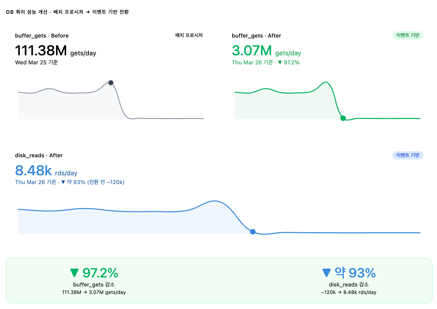 프로시저가 실행마다 수만~수십만 건을 전체 재계산하던 방식이 사라지면서, 변경된 데이터만 처리하는 이벤트 기반 구조로 전환된 결과입니다.